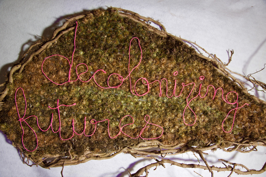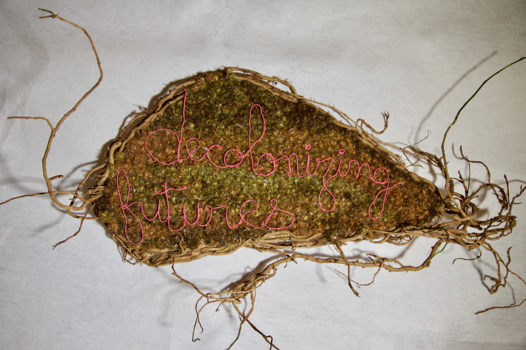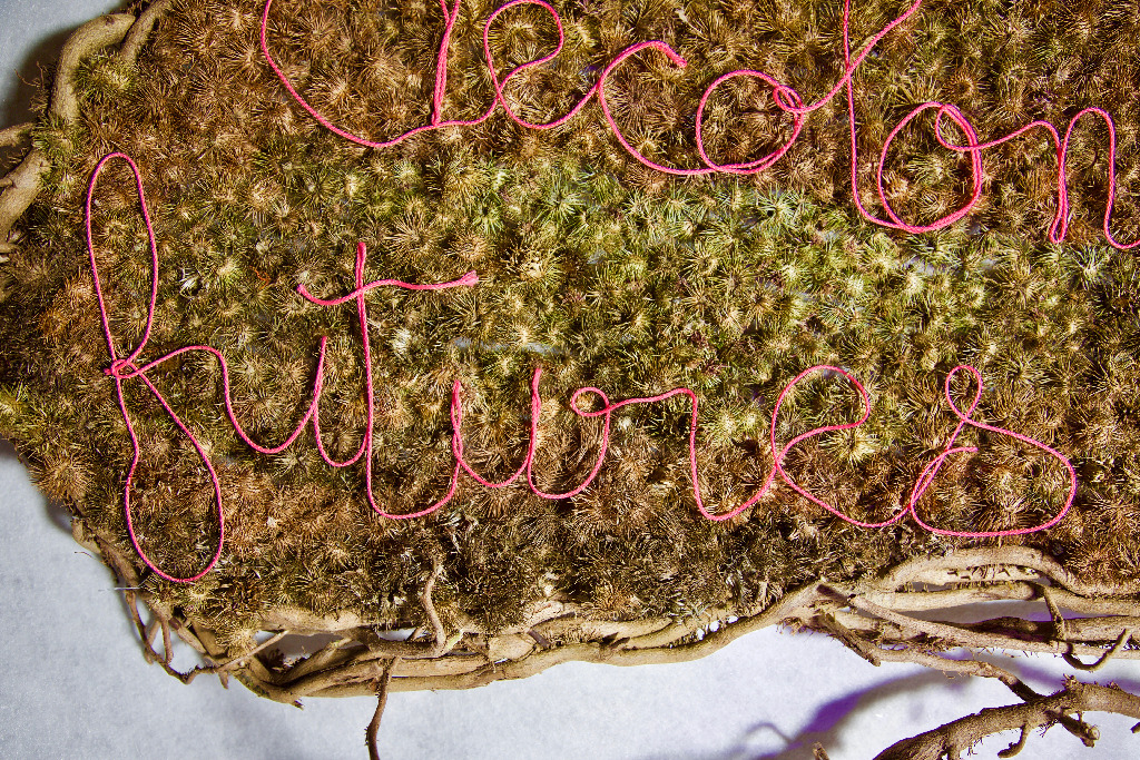 Sculpture réalisée à partir de lianes de lierre, de capitules et de graines de bardane, de fil fluorescent rose et de fil de cuivre réparateur.
